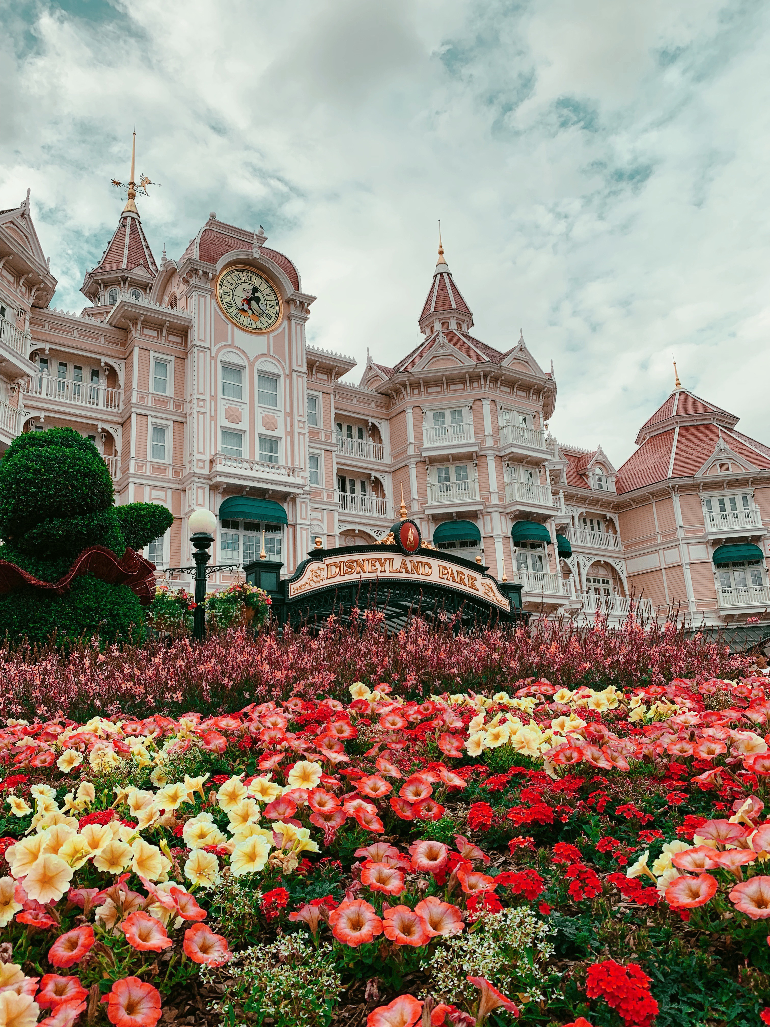 The entrance to the park goes directly underneath the Disneyland Hotel, a magical pink building which I would very much like to just live in forever, thank you very much, and opens into an adorable train plaza!